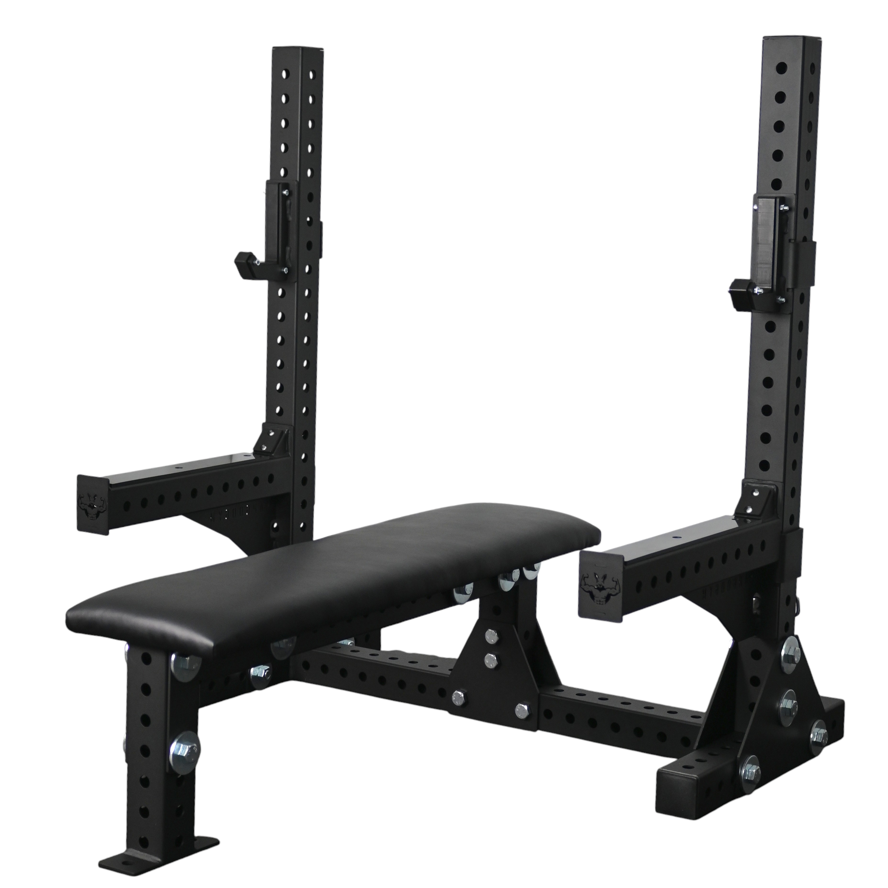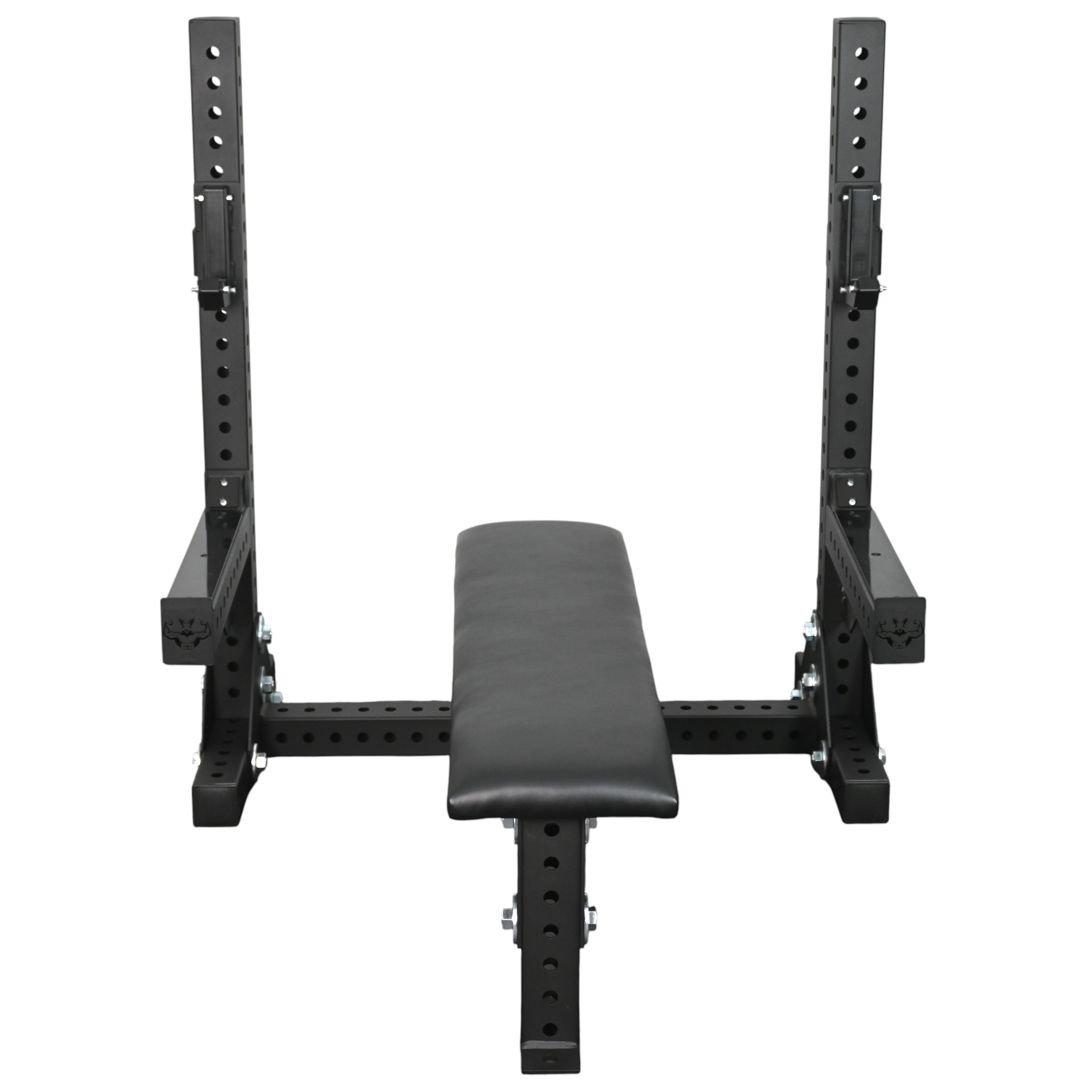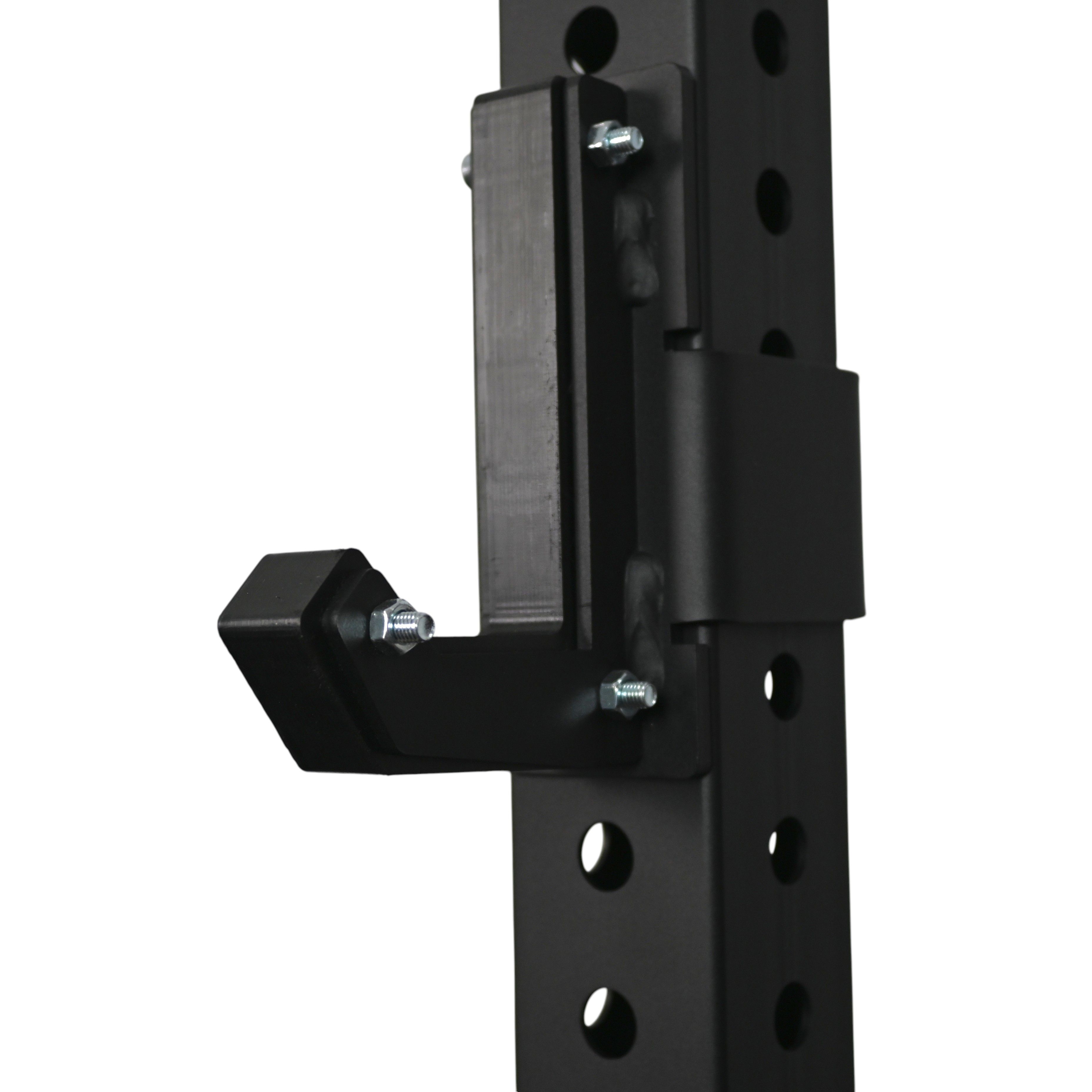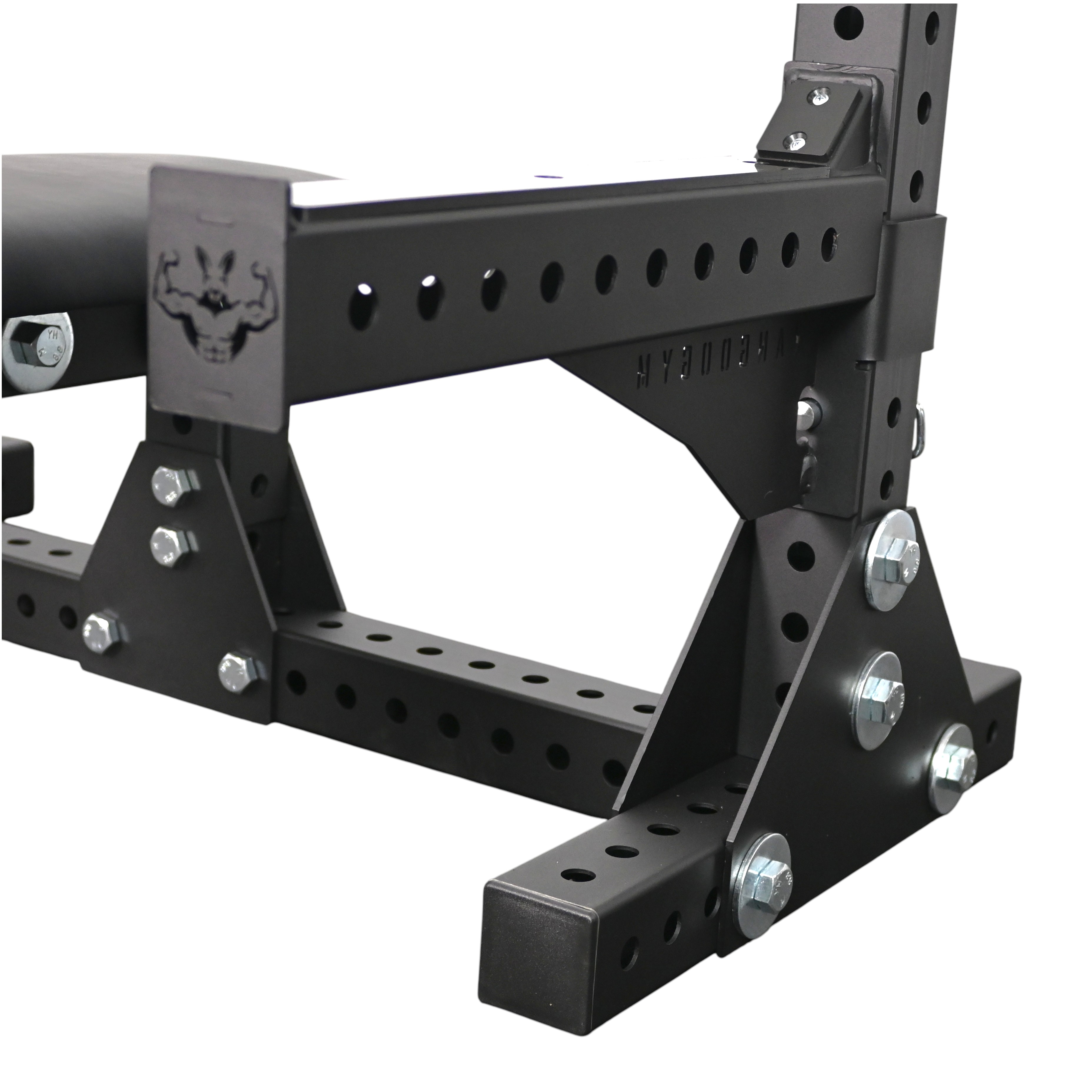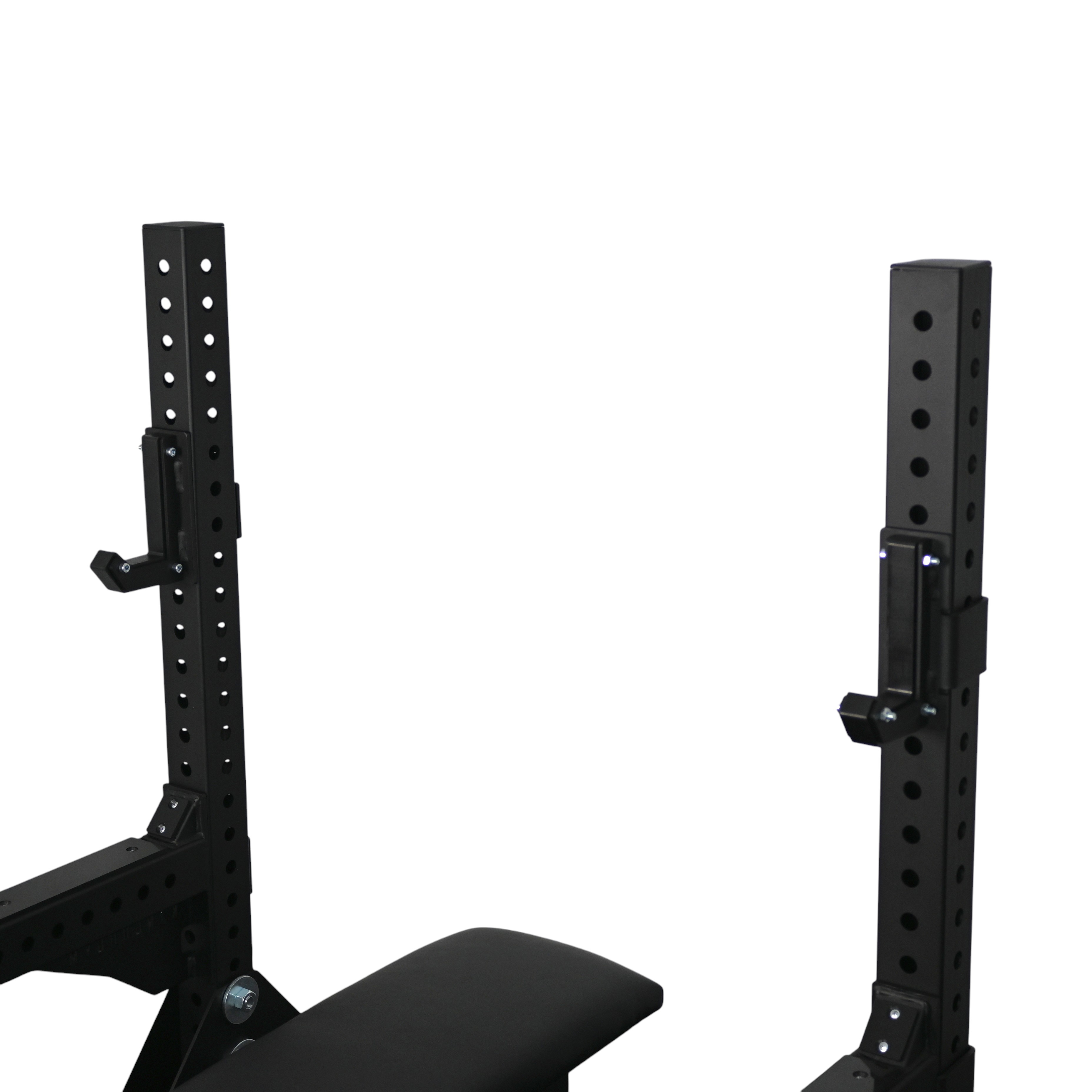 Ławka do wyciskania 80x80x3 z regulowanymi belkami asekuracyjnymi i hakami na sztangę. Konstrukcja oparta na grubych profilach stalowych zapewnia maksymalną stabilność i bezpieczeństwo.