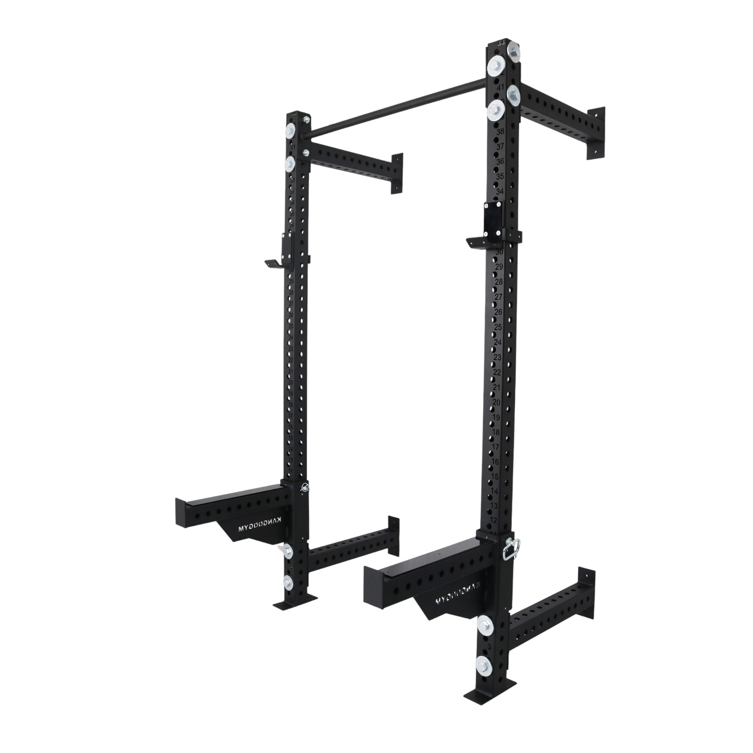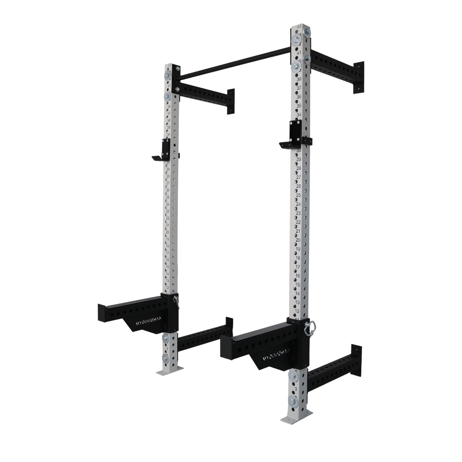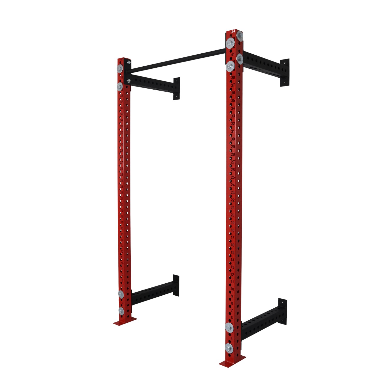Wall rack w tej konfiguracji pozwala zaoszczędzić miejsce, a jednocześnie zachowuje pełną funkcjonalność klasycznego racka treningowego — umożliwia bezpieczny trening siłowy z wykorzystaniem haków, asekuracji i akcesoriów.