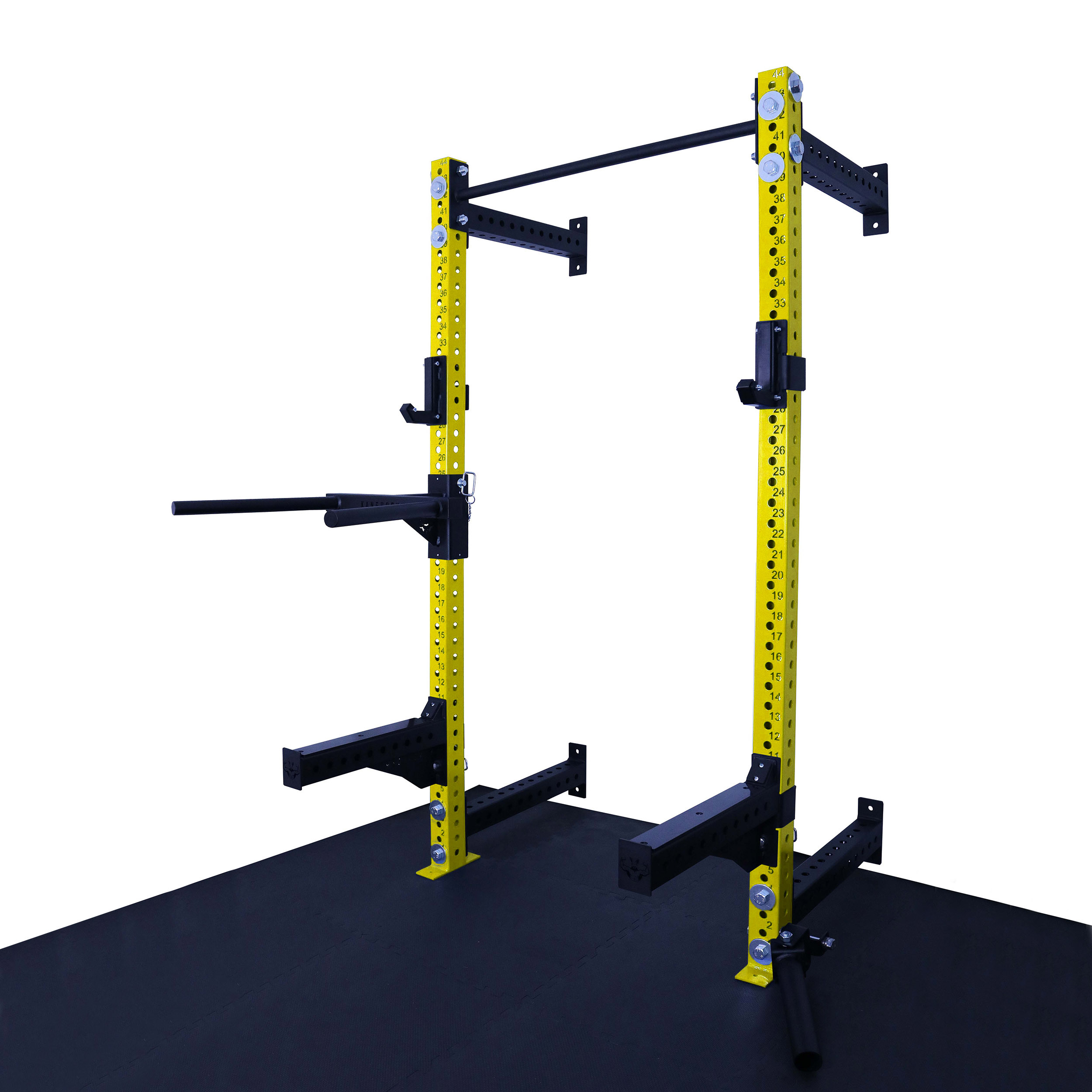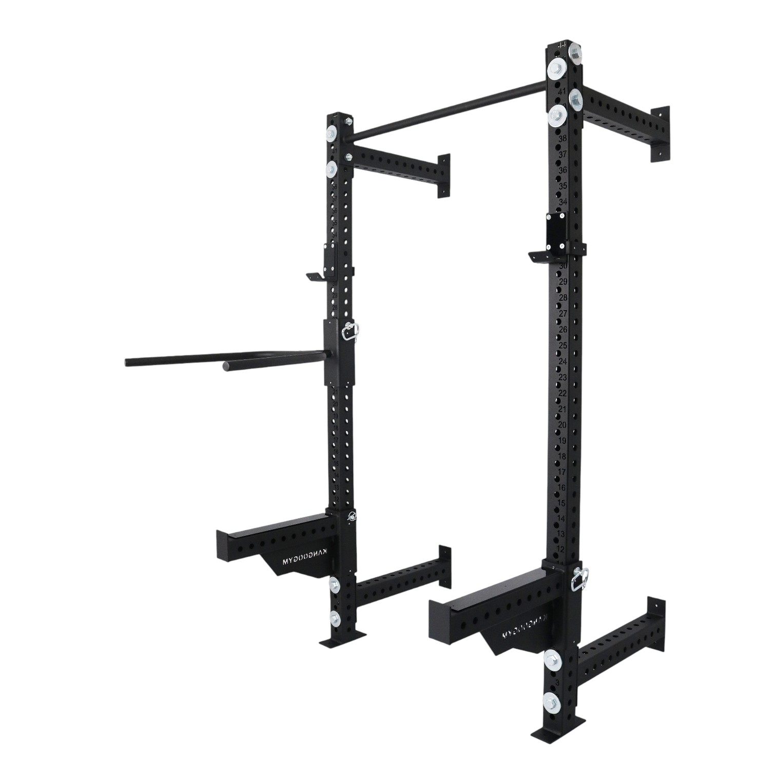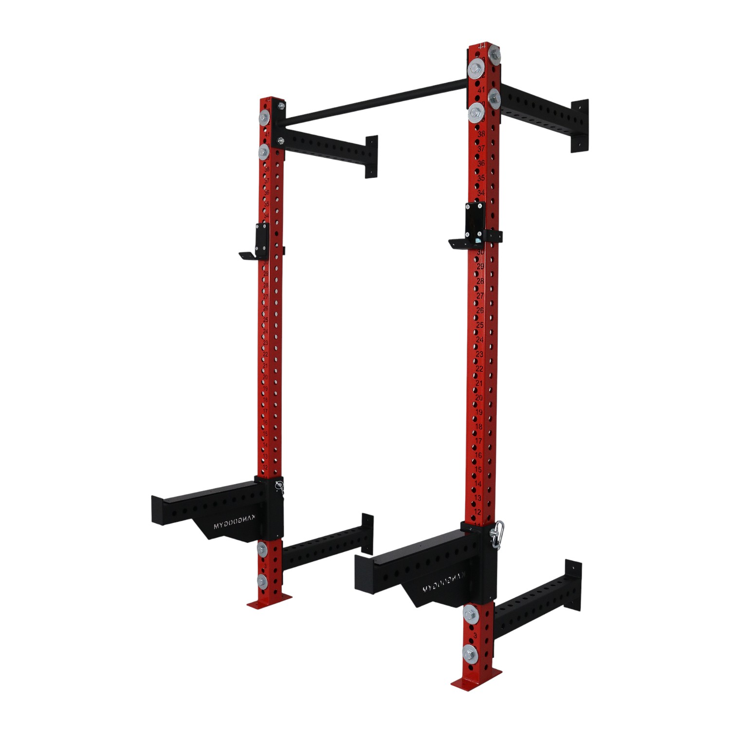 Wall rack w tej konfiguracji pozwala zaoszczędzić miejsce, a jednocześnie zachowuje pełną funkcjonalność klasycznego racka treningowego — umożliwia bezpieczny trening siłowy z wykorzystaniem haków, asekuracji i akcesoriów.