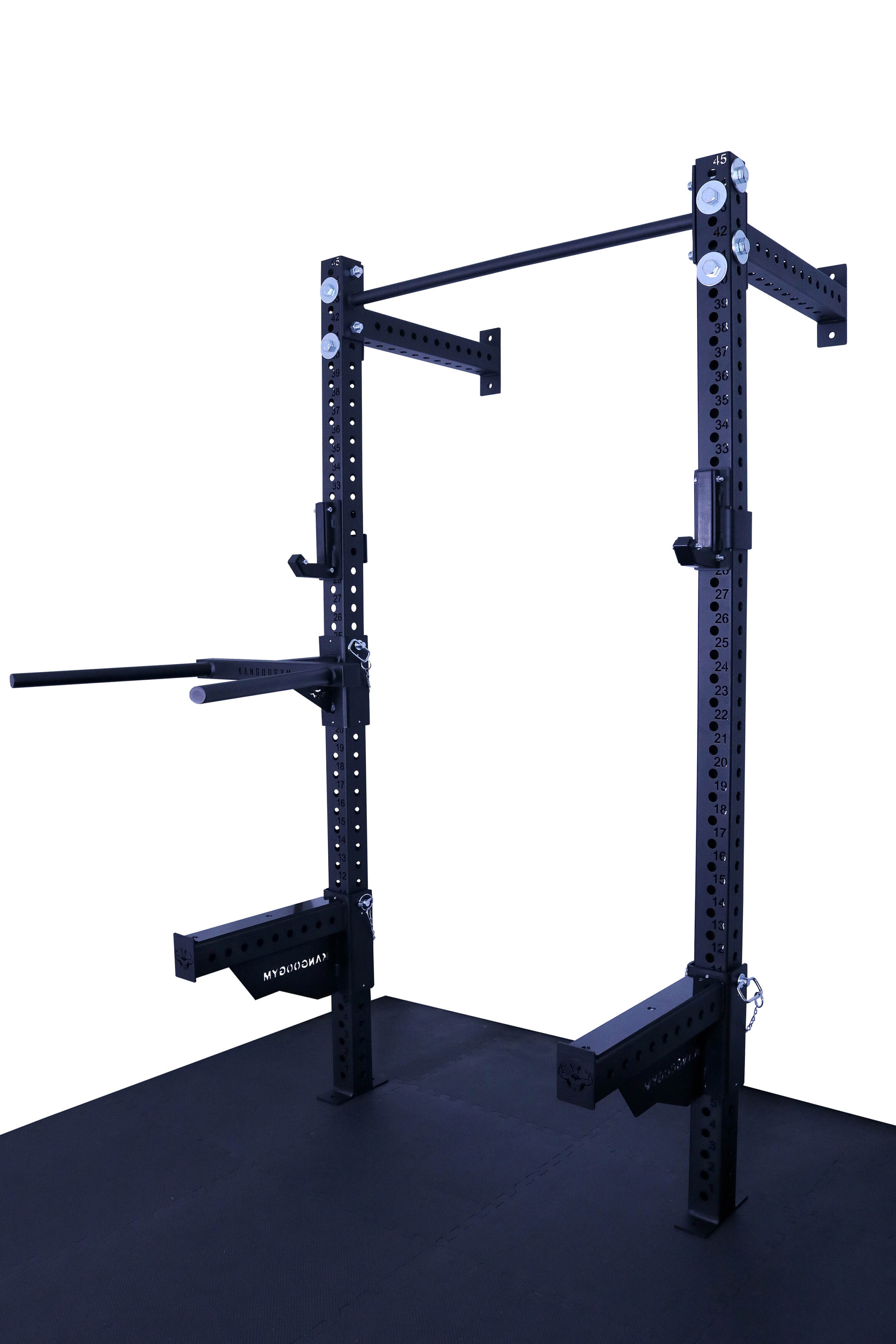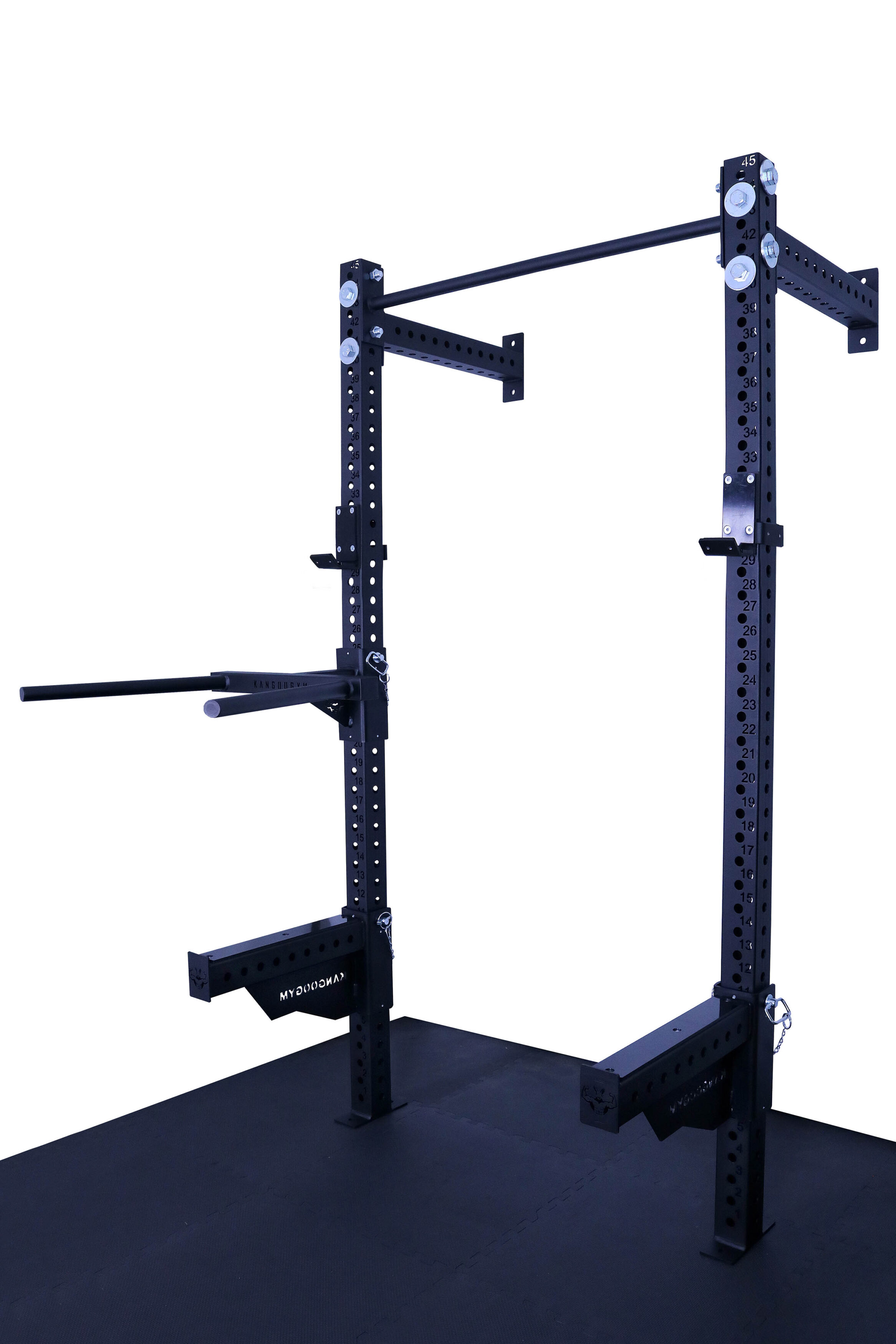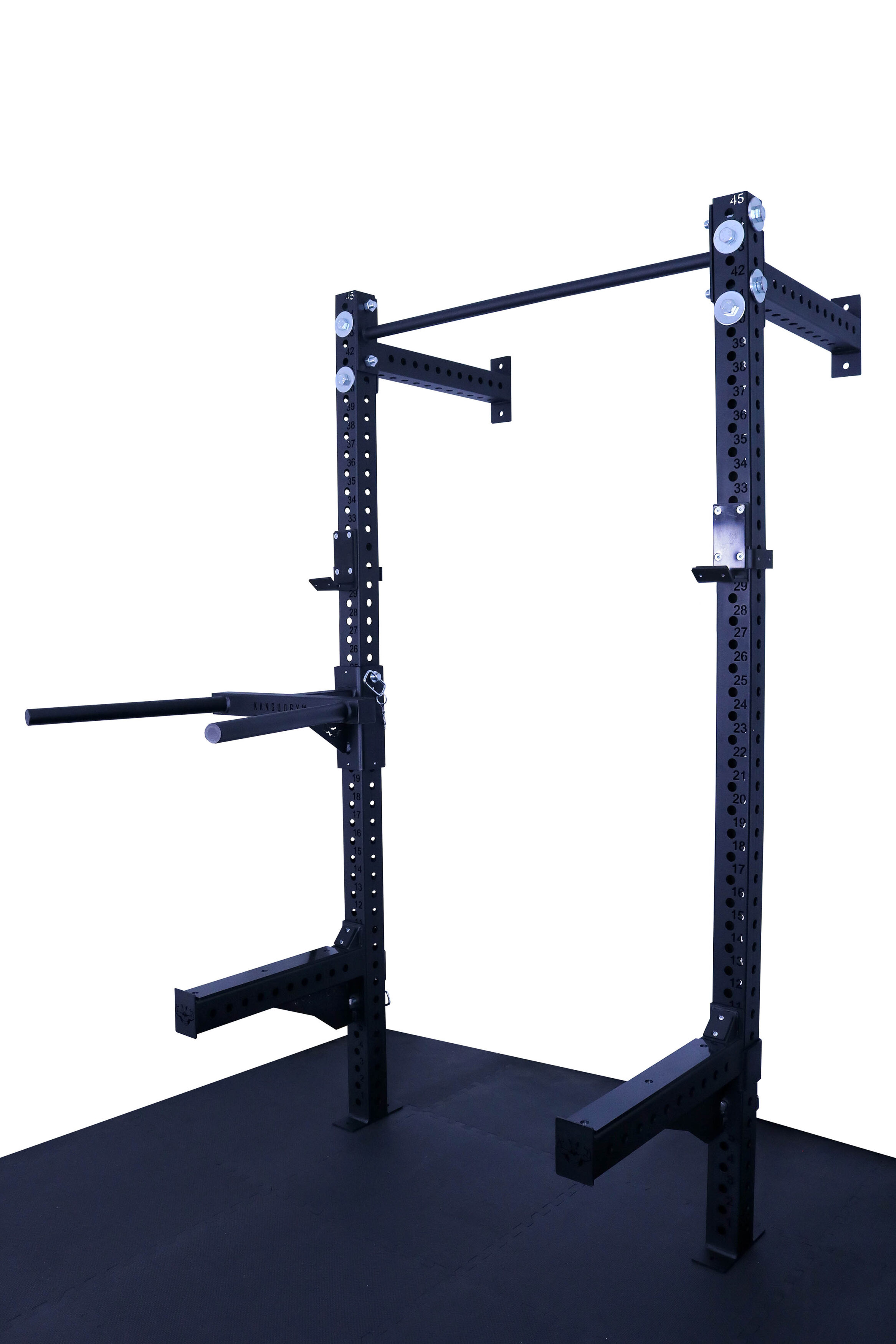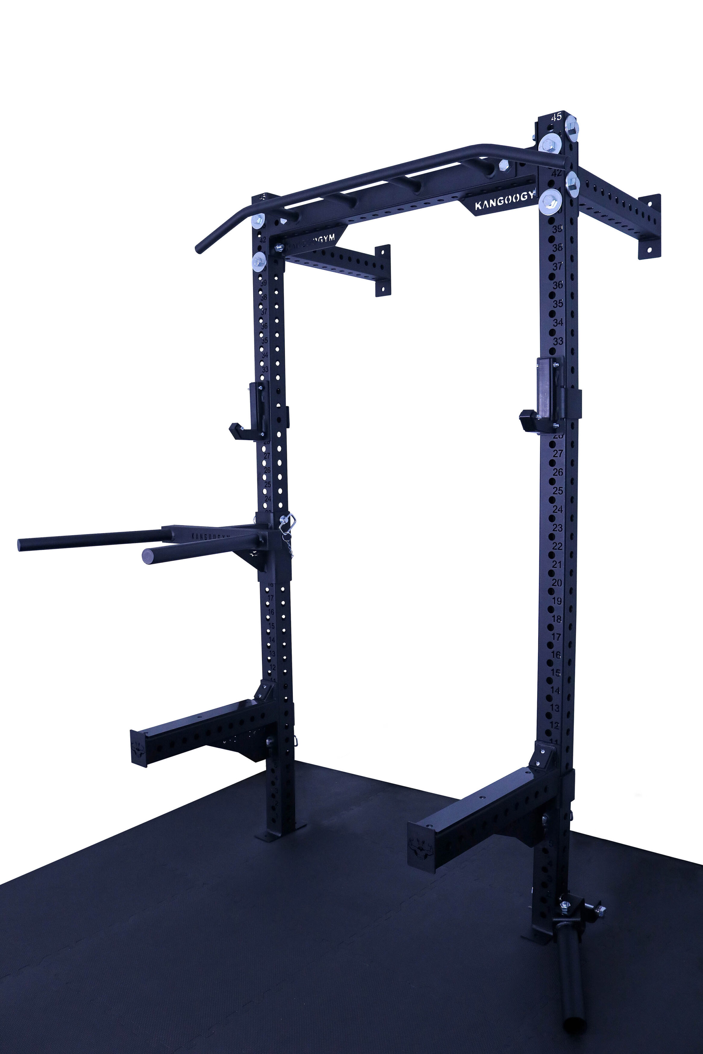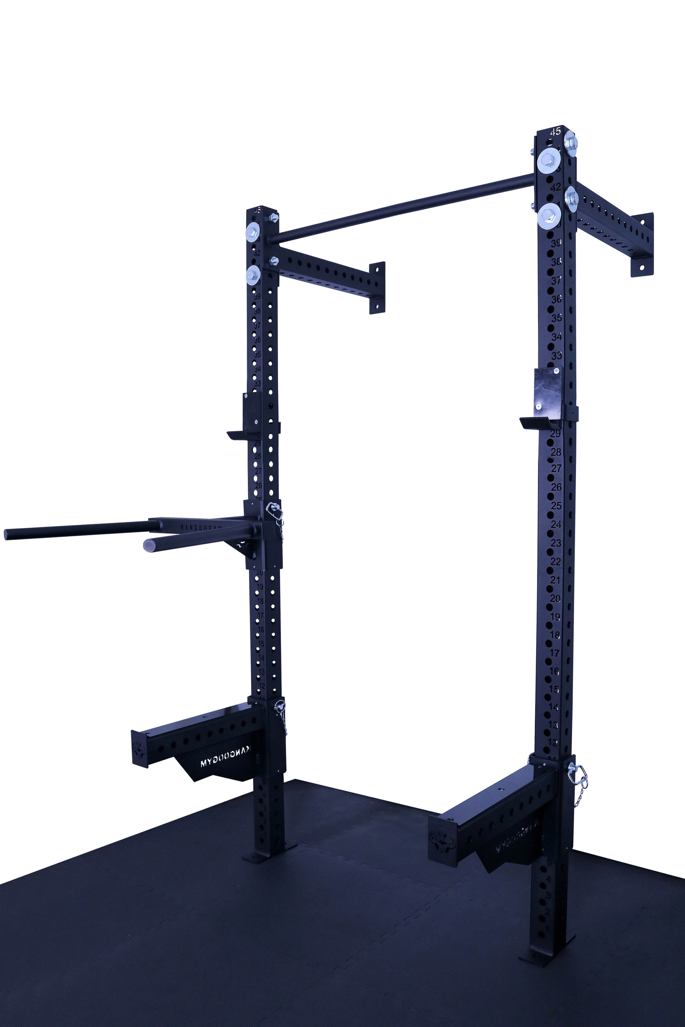 Otwory w konstrukcji są wypalane laserowo co 50 mm, co daje bardzo szerokie możliwości regulacji i dopasowania wysokości akcesoriów do każdego ćwiczenia. Klatka umożliwia łatwe mocowanie akcesoriów, co sprawia, że trening staje się jeszcze bardziej efektywny. Solidna konstrukcja, mocowana do ściany i podłogi gwarantuje stabilność.