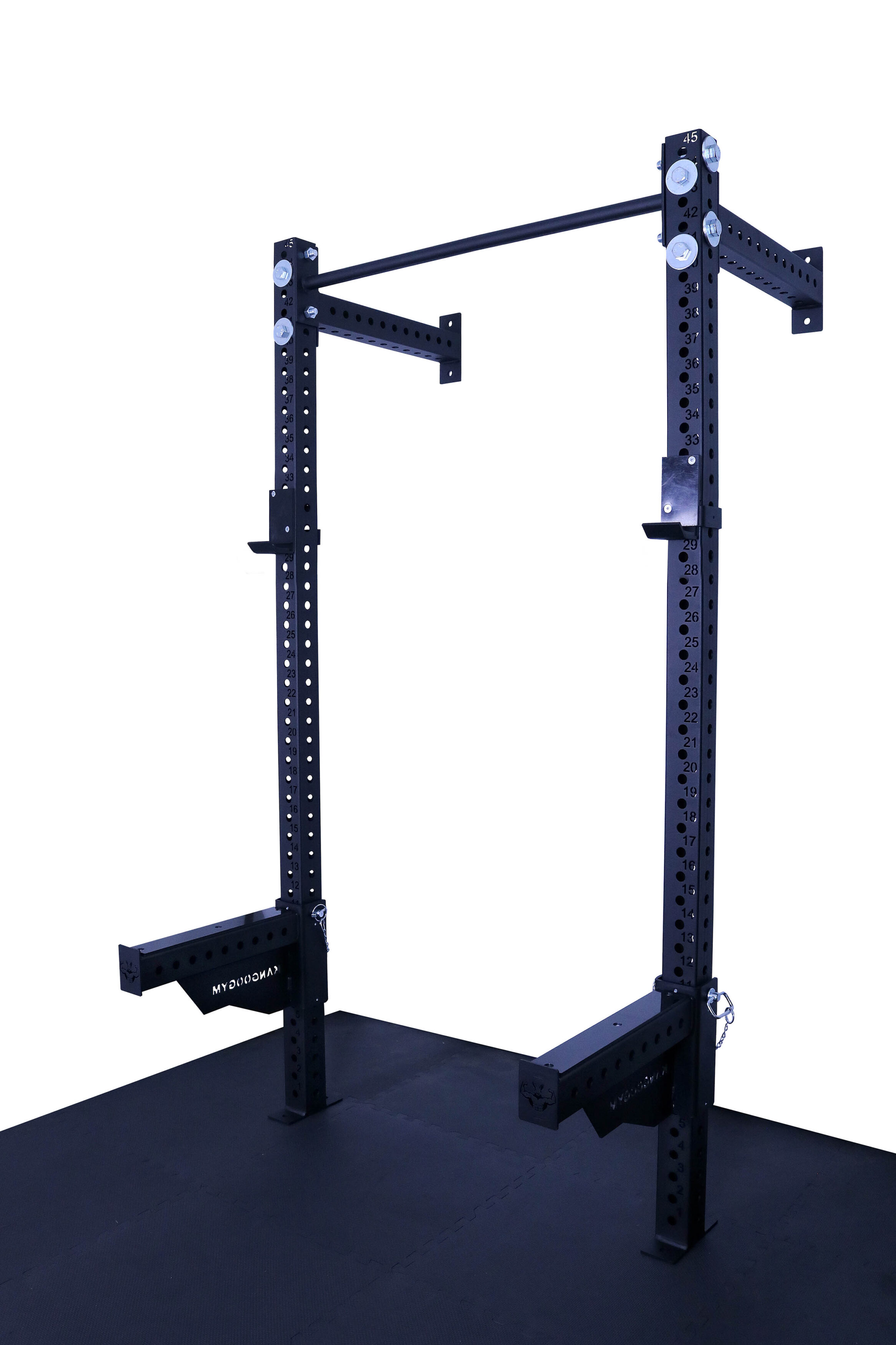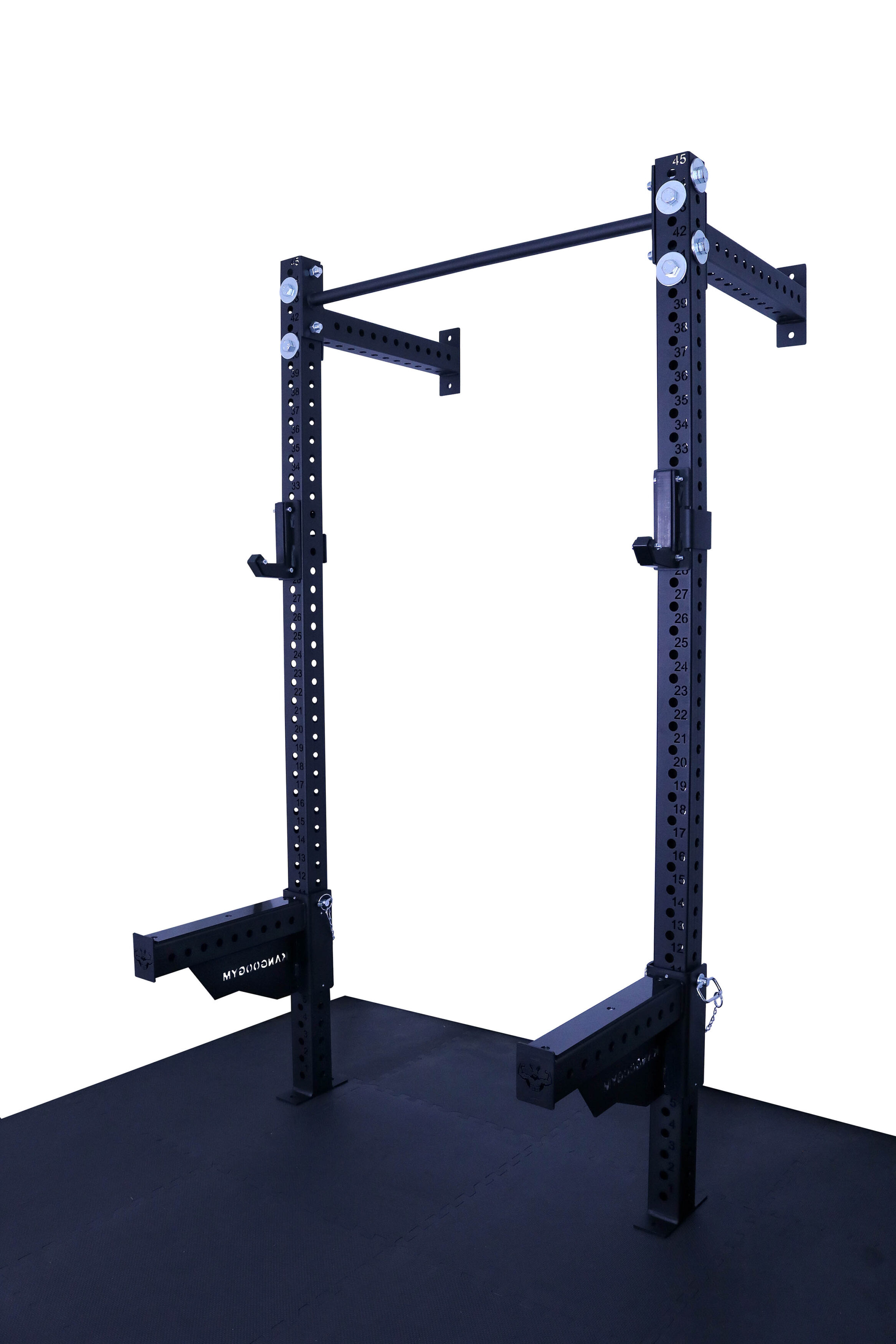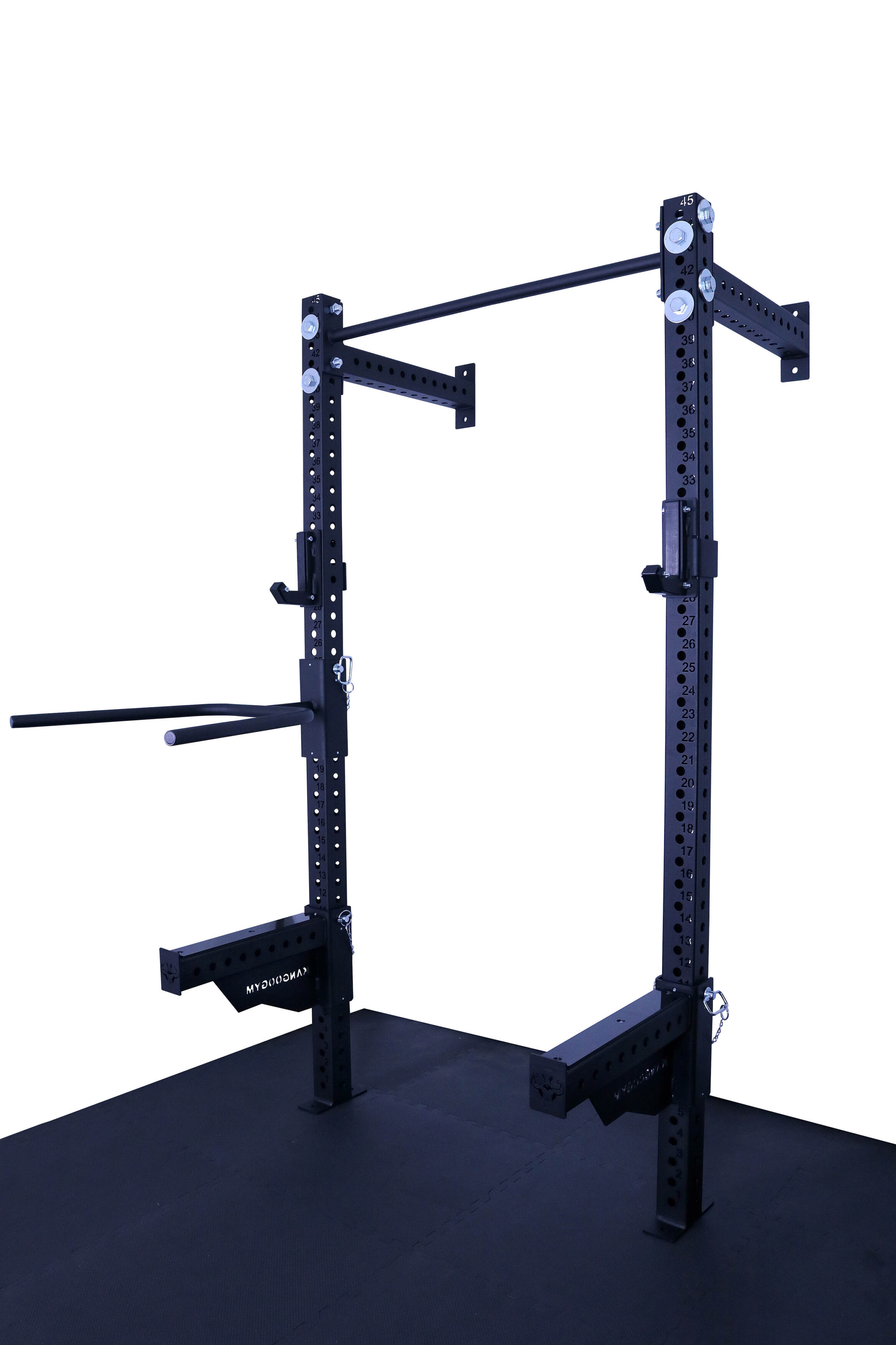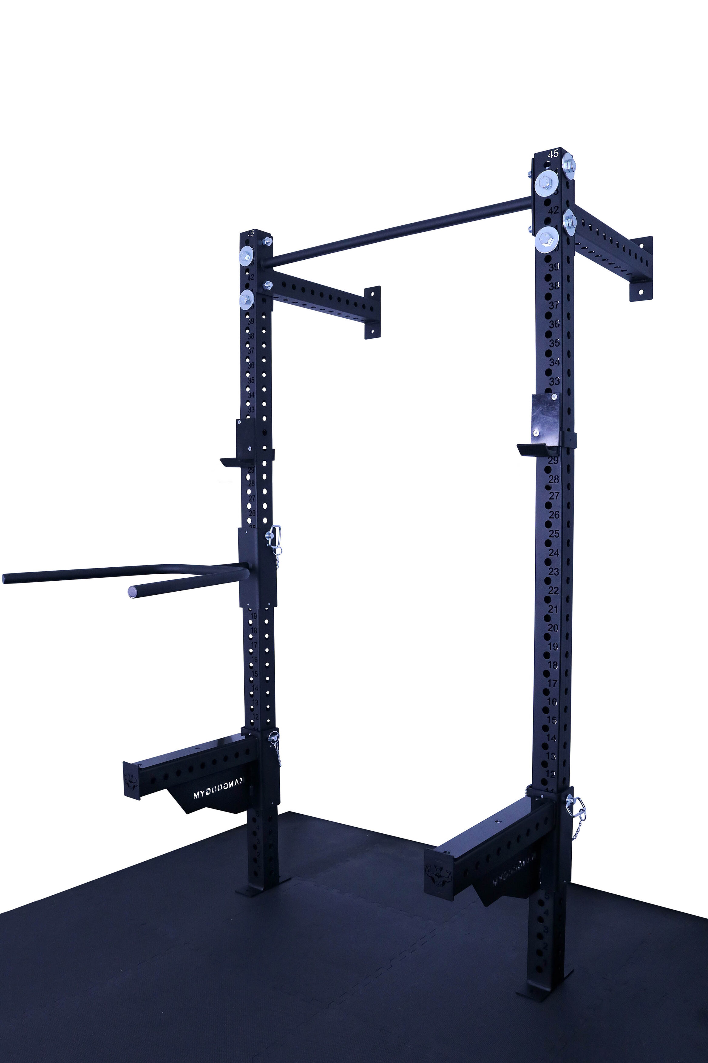 Otwory w konstrukcji są wypalane laserowo co 50 mm, co daje bardzo szerokie możliwości regulacji i dopasowania wysokości akcesoriów do każdego ćwiczenia. Klatka umożliwia łatwe mocowanie akcesoriów, co sprawia, że trening staje się jeszcze bardziej efektywny. Solidna konstrukcja, mocowana do ściany i podłogi gwarantuje stabilność.